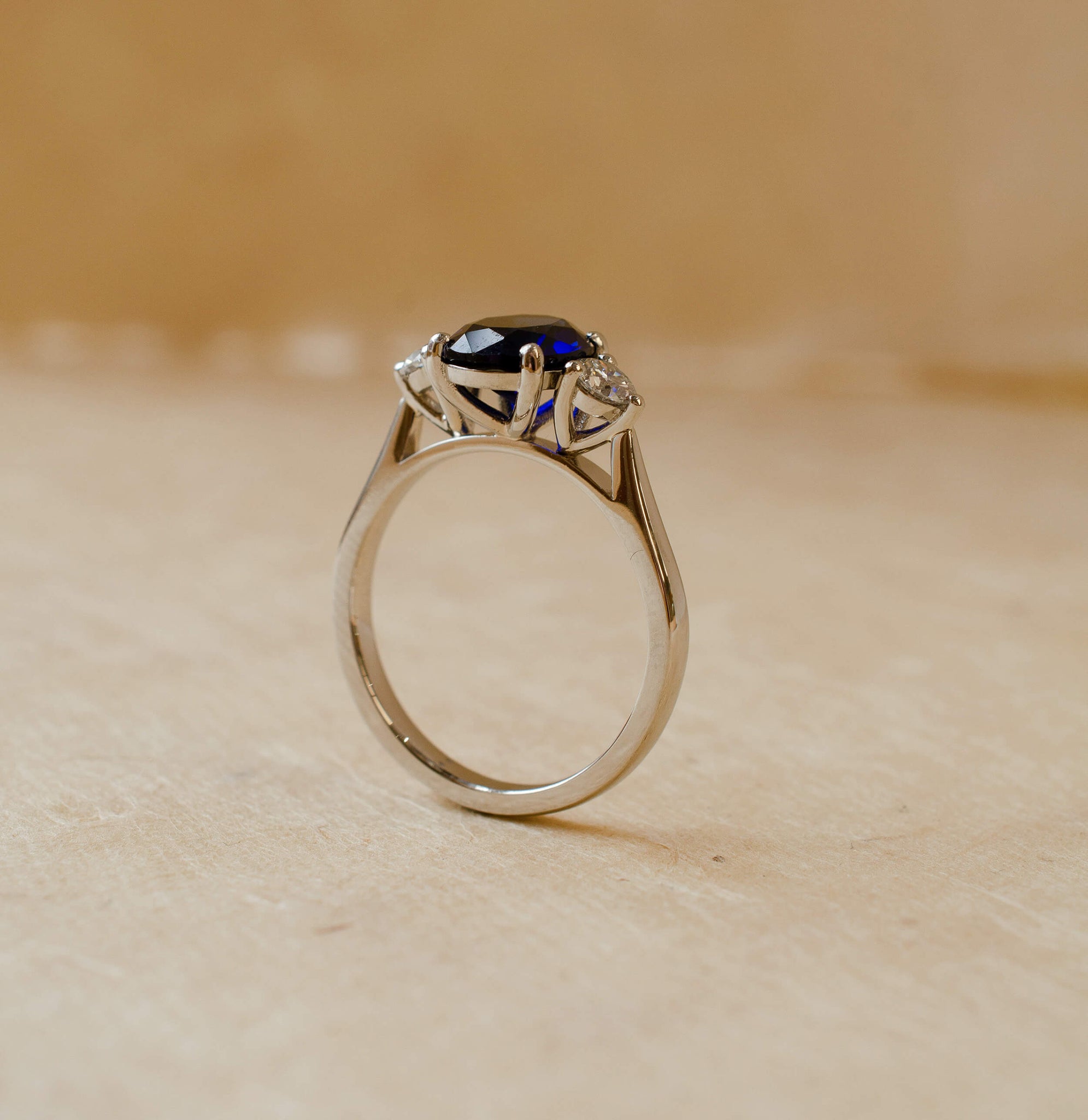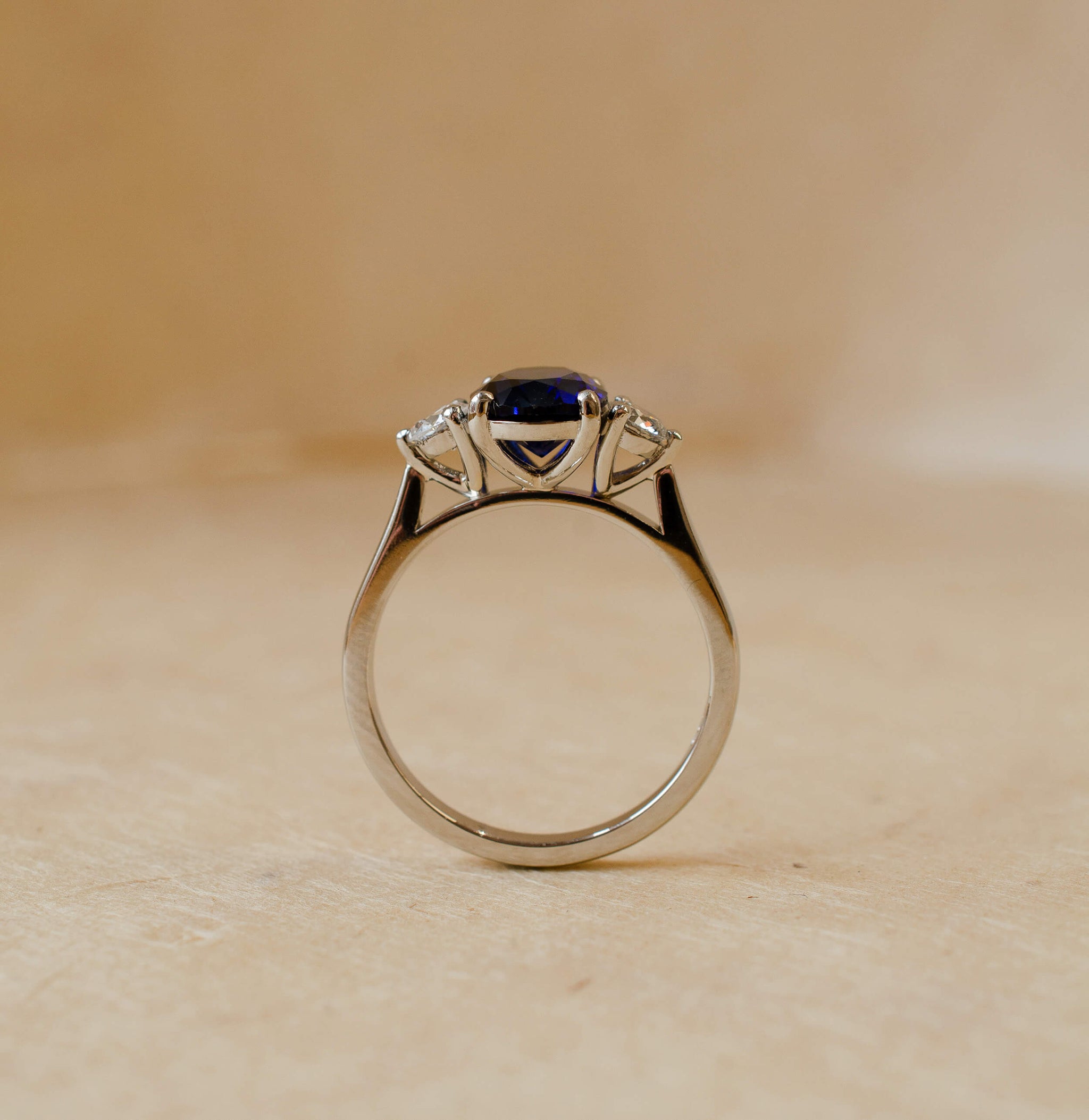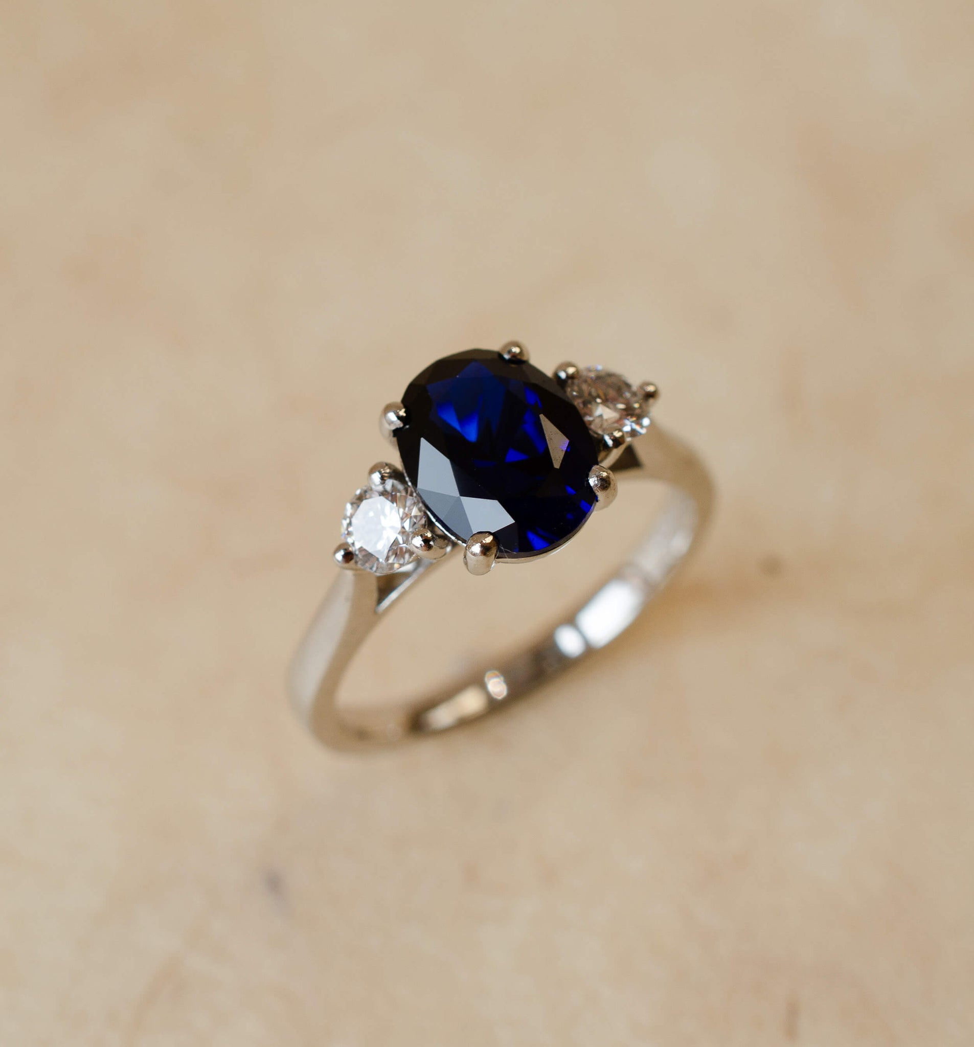 A platinum, oval lab grown sapphire and round brilliant cut diamond trilogy style ring.