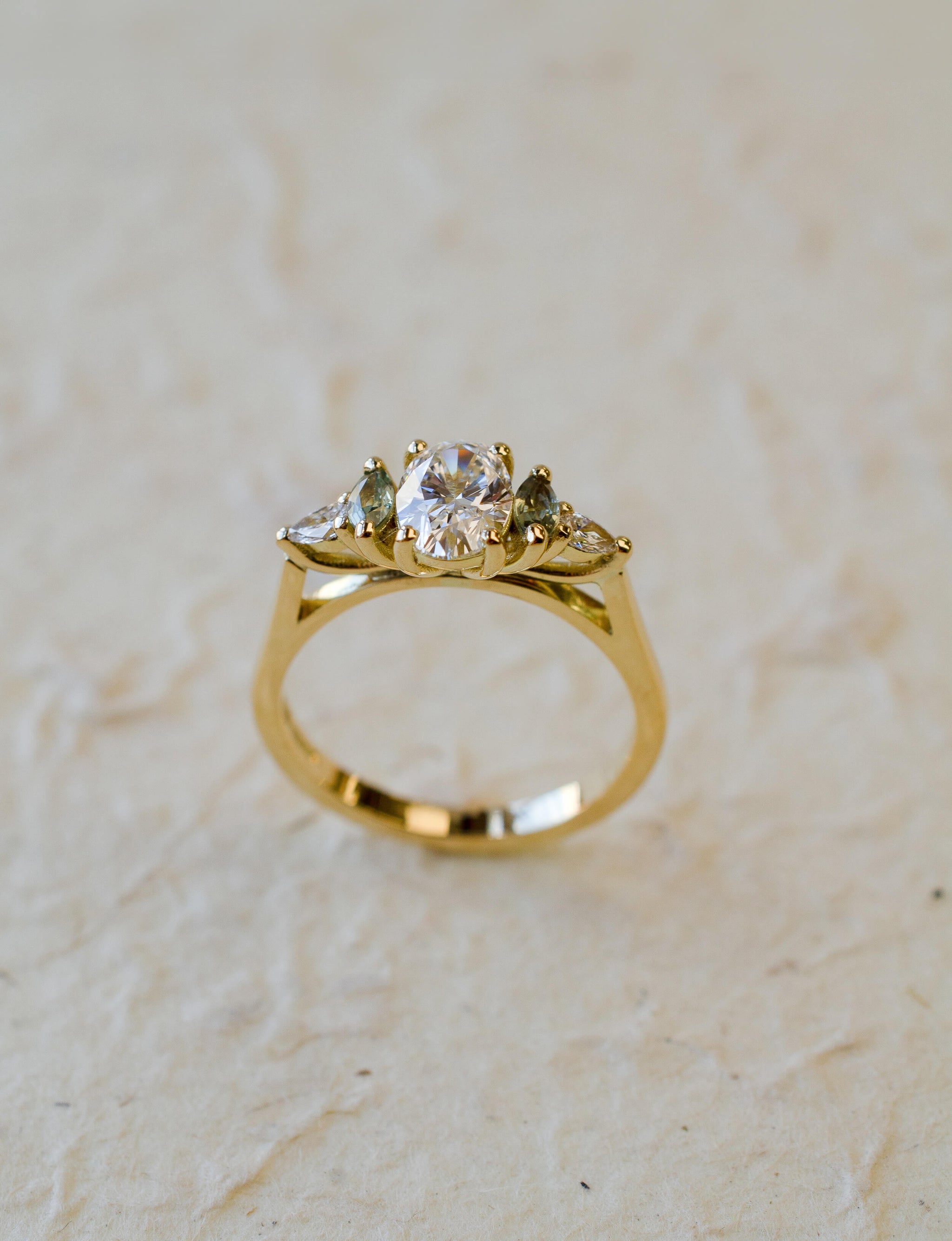 An 18ct yellow gold five stone engagement ring, set with an oval 0.76ct DVS1 lab-grown diamond, marquise cut green sapphires and lab-grown pear cut diamonds.