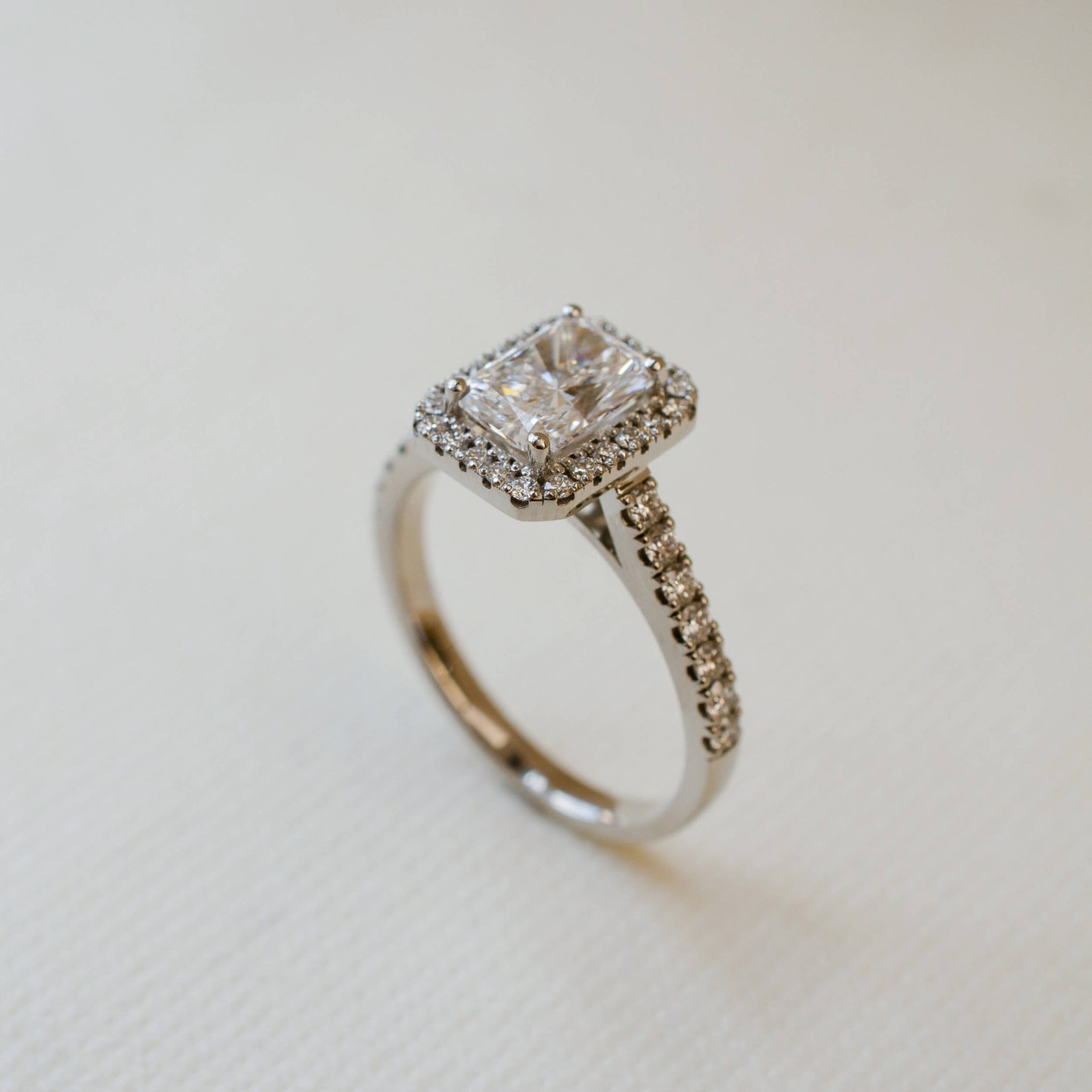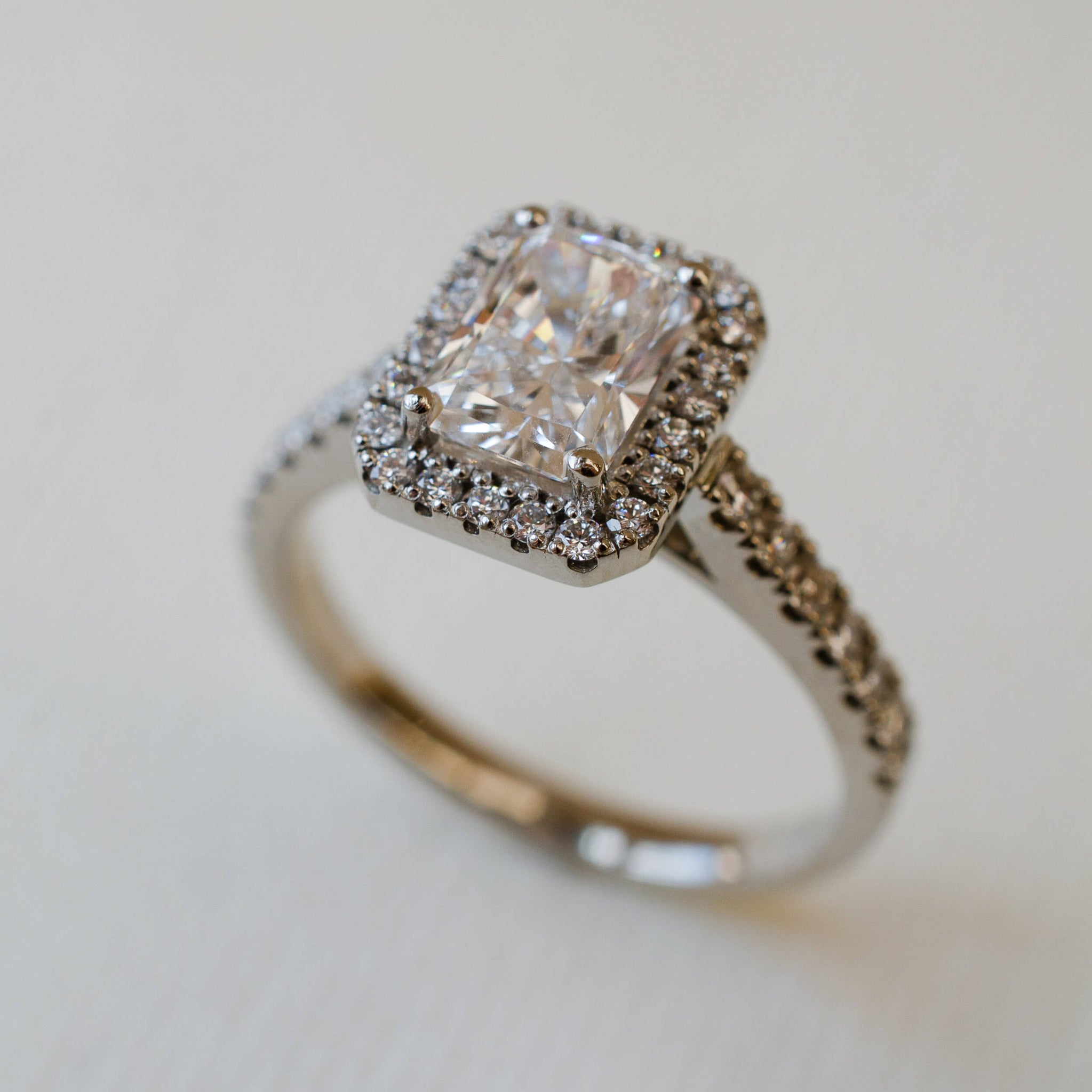 A platinum and diamond halo style engagement ring. The ring has been set with a radiant cut lab-grown diamond surrounded by a halo of small round brilliant cut diamonds.